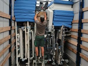 Cette fois-ci, c’est un camion de matériel médical et de bureau qui part de Salies. Le camion arrive tôt le matin et le chargement commence à 9h.