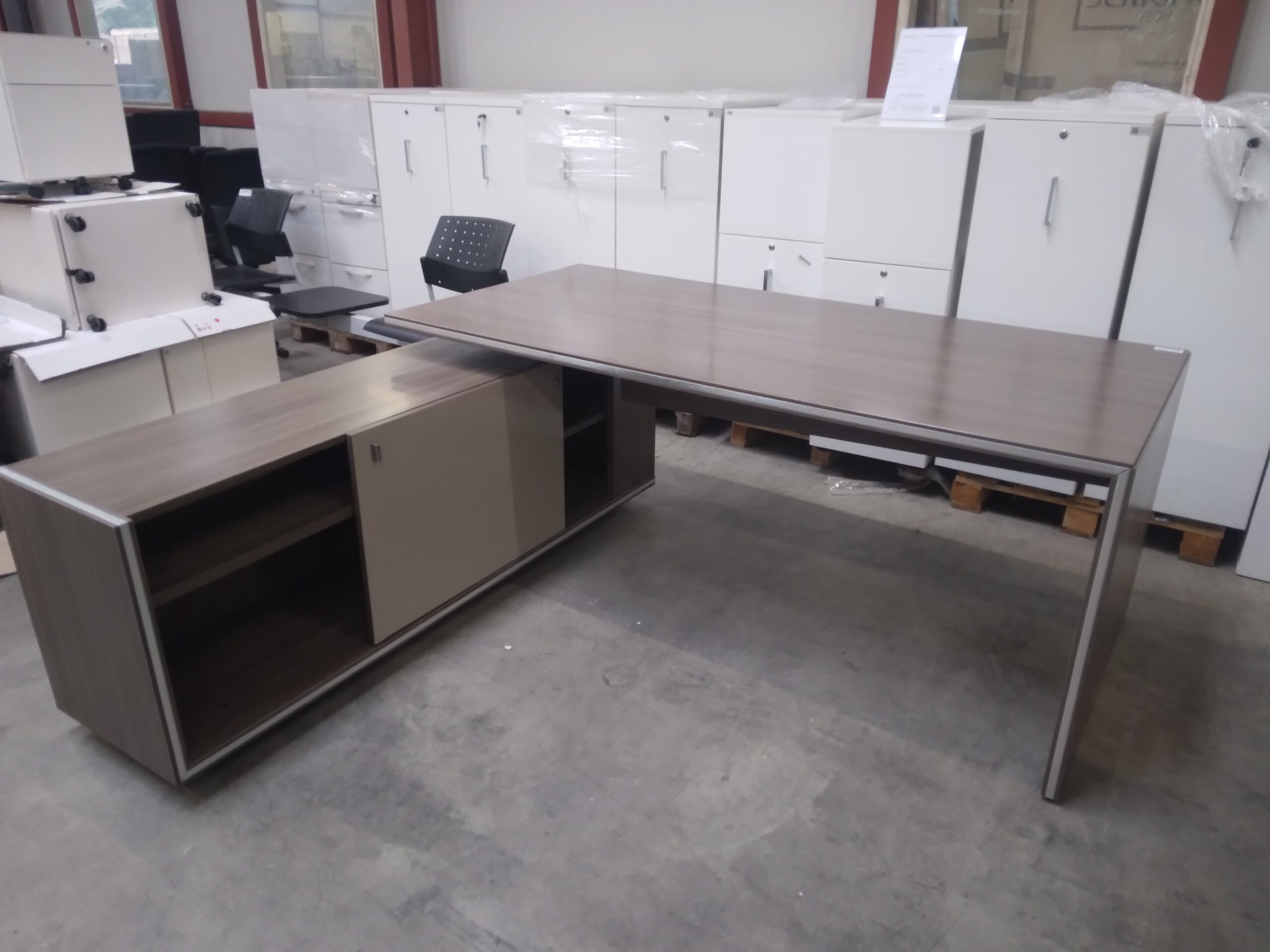 Comptoir d’accueil en excellent état. Grand bureau avec un retour offrant un vaste espace de rangement.