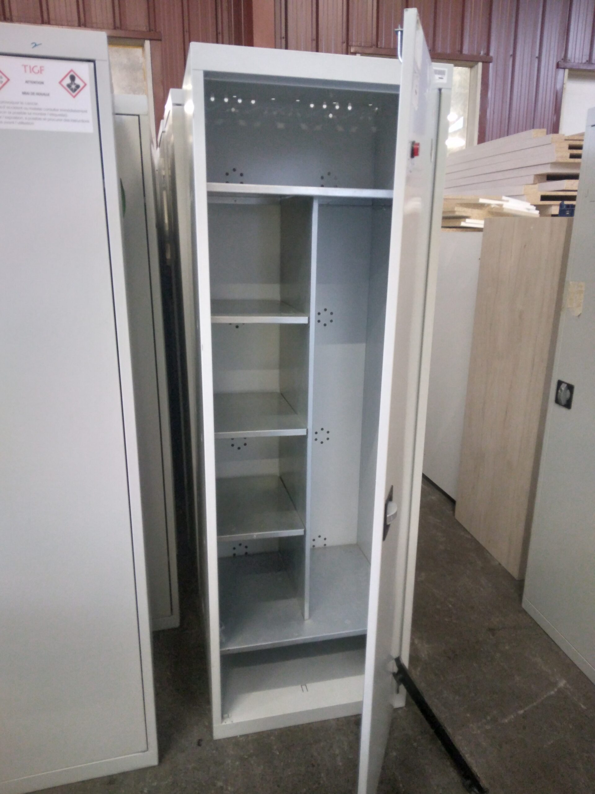 Vestiaire métallique avec étagères et penderie.